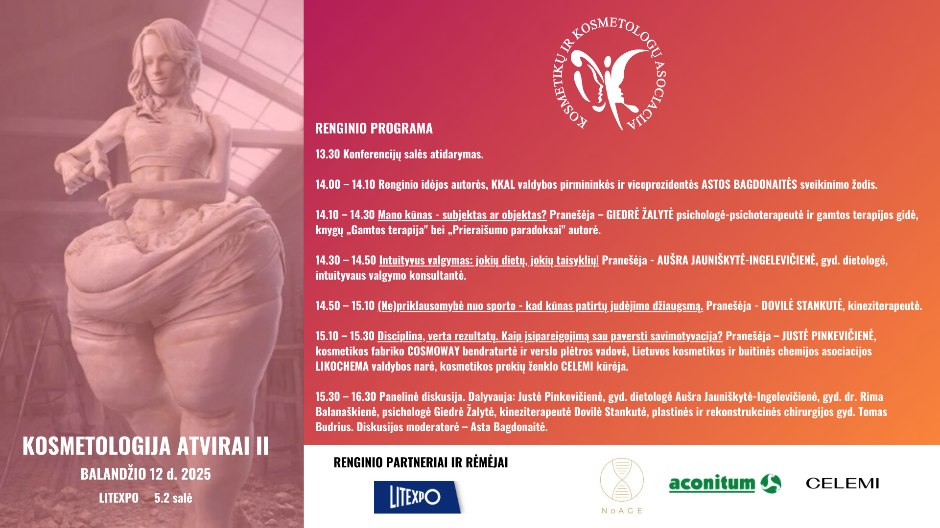 KOSMETOLOGIJA ATVIRAI II – tai jau antras renginys, inicijuotas ilgametės KKAL valdybos narės Astos Bagdonaitės. Renginių ciklas orientuotas į visapusišką grožio procedūrų poveikio analizę, mitų apie grožio procedūras sklaidymą, sąžiningo grožio paslaugų verslo rėmimą, grožio paslaugų vartotojų švietimą bei kosmetikų ir kosmetologų profesijos populiarinimą.